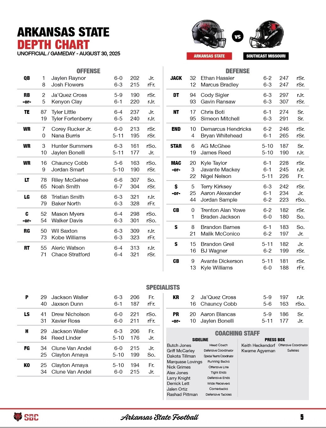 Arkansas State has released its official depth chart for Saturday’s season opener against Southeast Missouri, giving Red Wolves fans their first detailed look at how the roster will line up to start the 2025 campaign.
