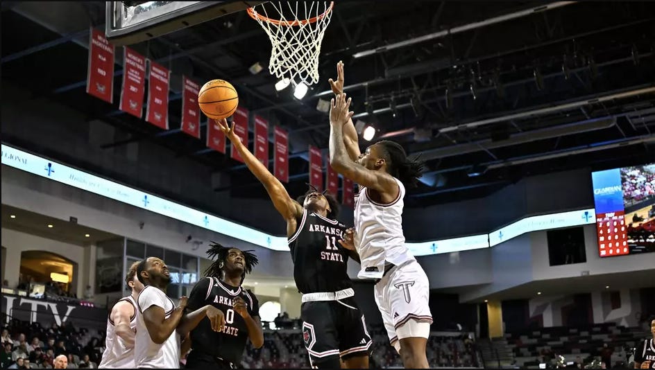 Arkansas State men’s basketball held Troy without a field goal for the final six minutes, 58 seconds on Saturday afternoon and rallied from a 13-point deficit to defeat the Trojans 84-78 inside Trojan Arena.